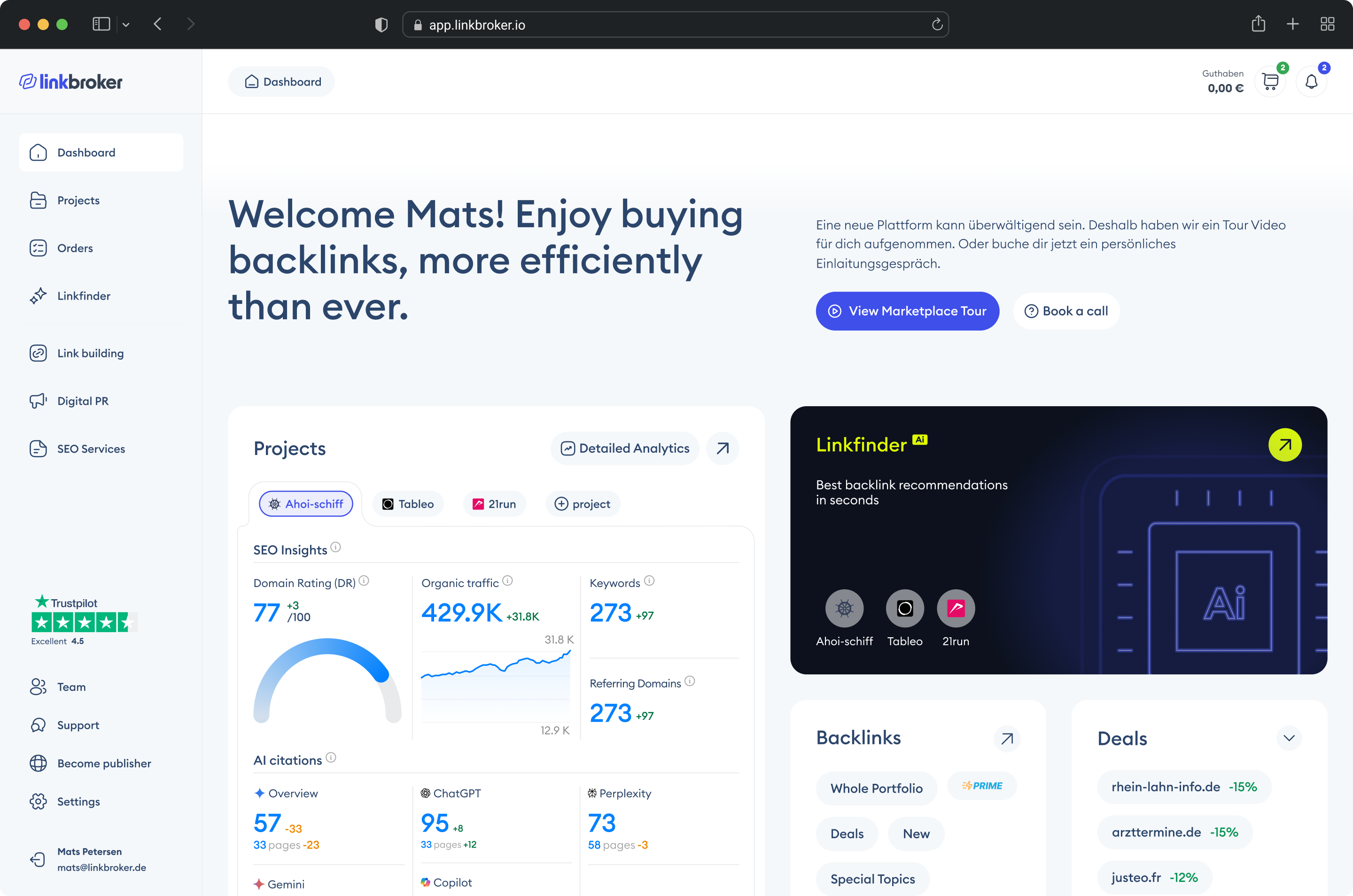 Co-founded Linkbroker. Joint CEO. Led design and operations, co-led product. 1,100 clients, 14 employees at exit, two and a half years – on top of earlier years at Backlinked. Both among Germany's leading SEO marketplaces.
