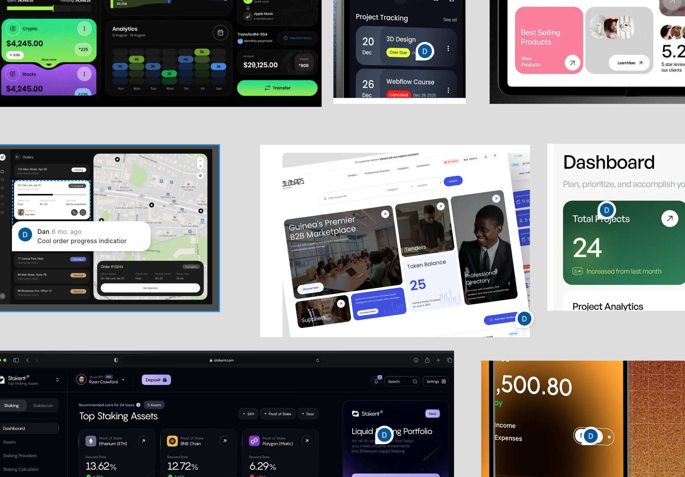 The brand system had already locked in colour, typography, and the core component styles. What it hadn't defined yet was everything a dashboard actually needs – card layouts, gradient treatments, progress indicators for orders, dropdown patterns that made sense for the data we were showing, affordances to make clickable tiles feel clickable, and the structure of a to-do feed. So the moodboard was targeted: not a general mood-fishing exercise, but a deliberate hunt for references the existing system didn't yet have answers for.