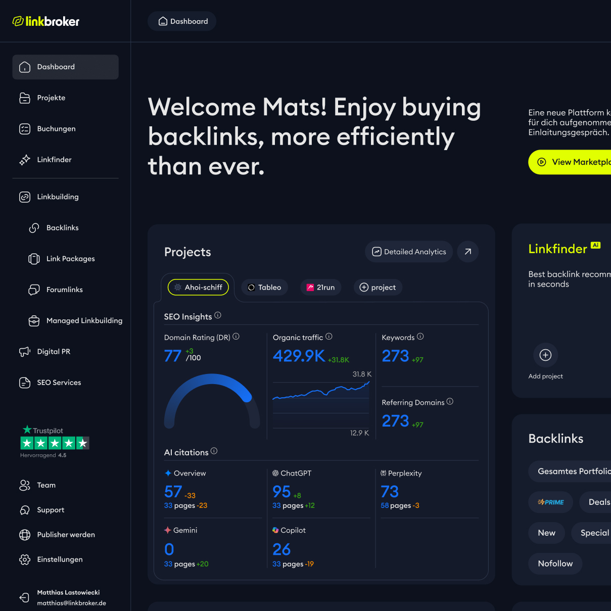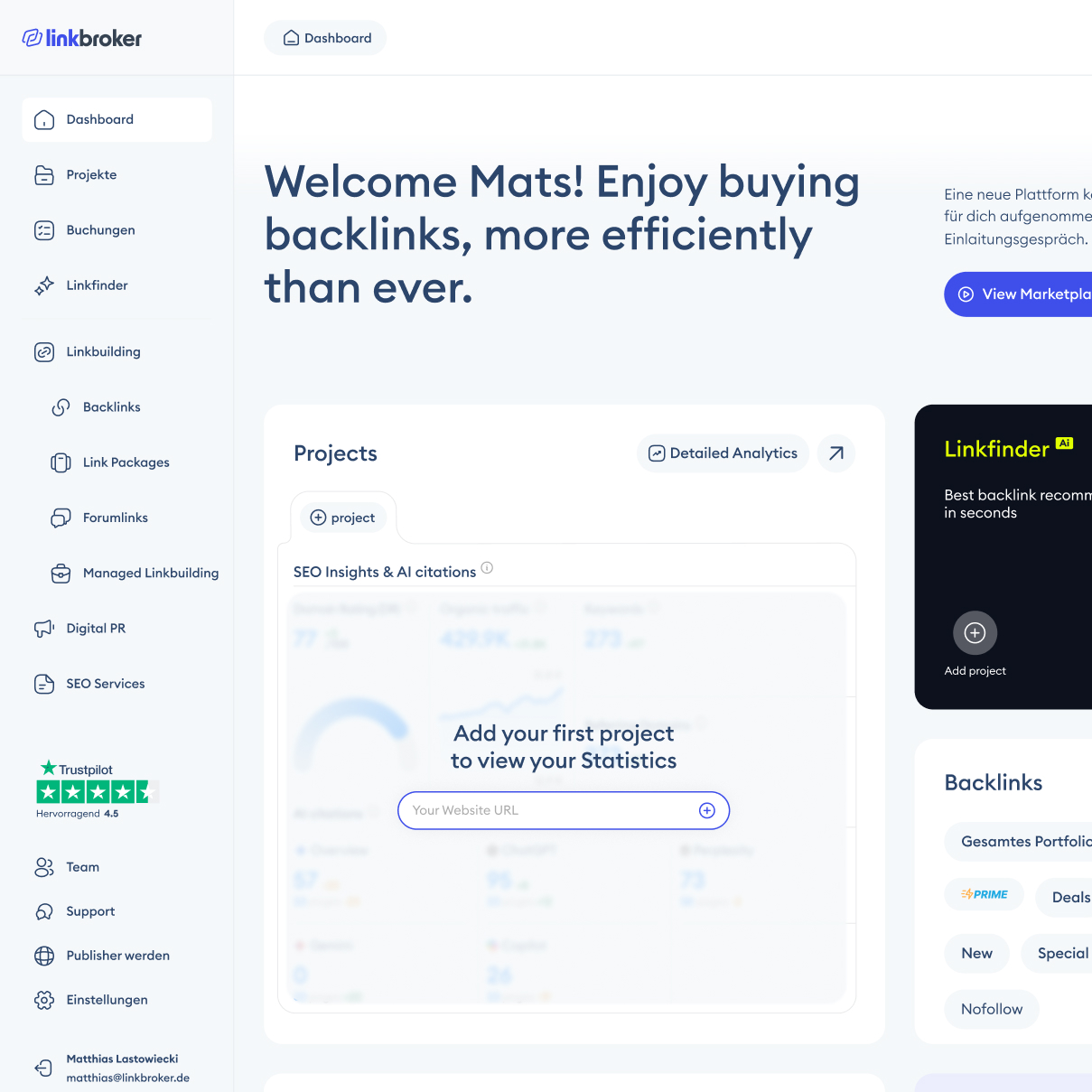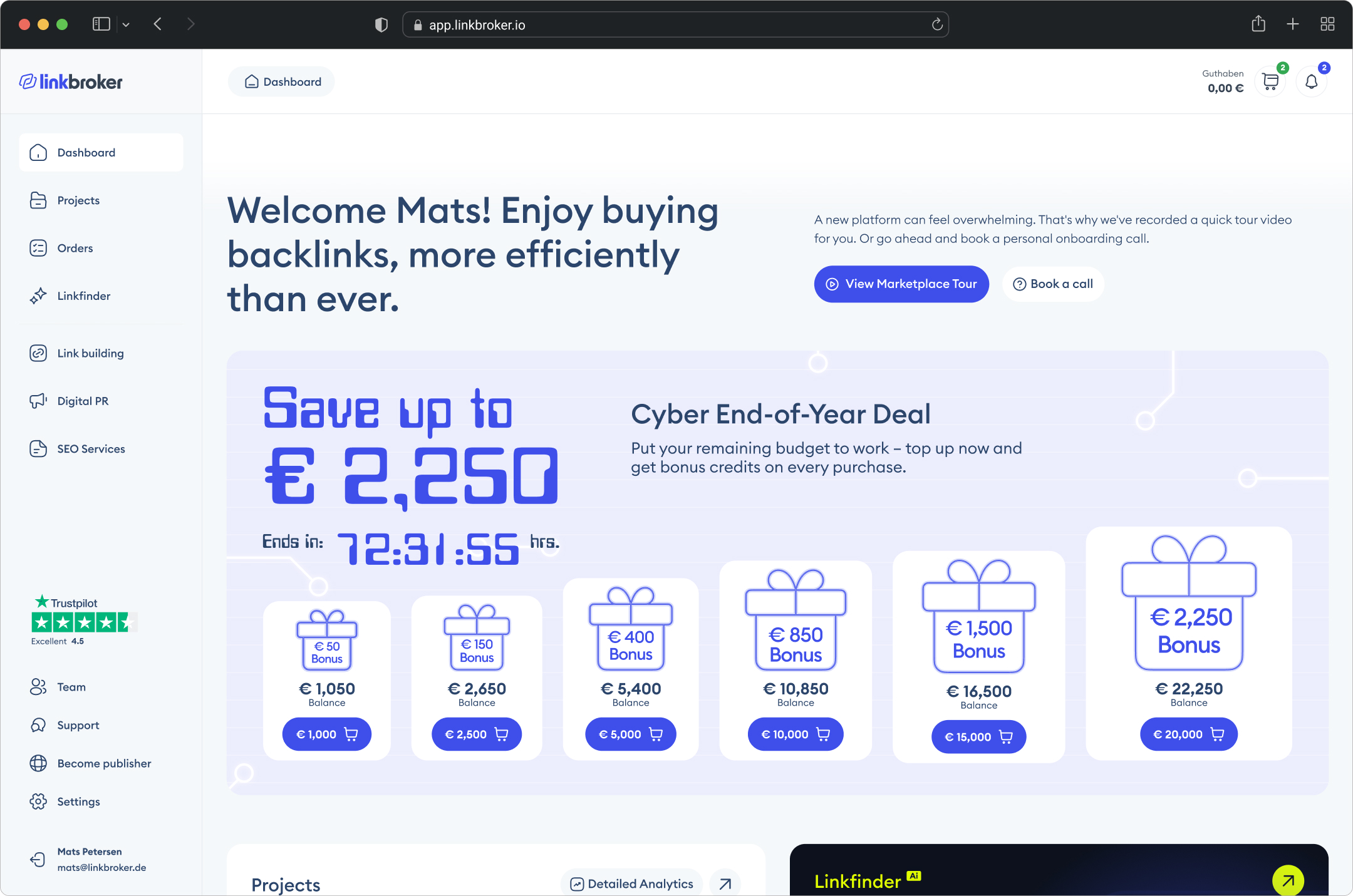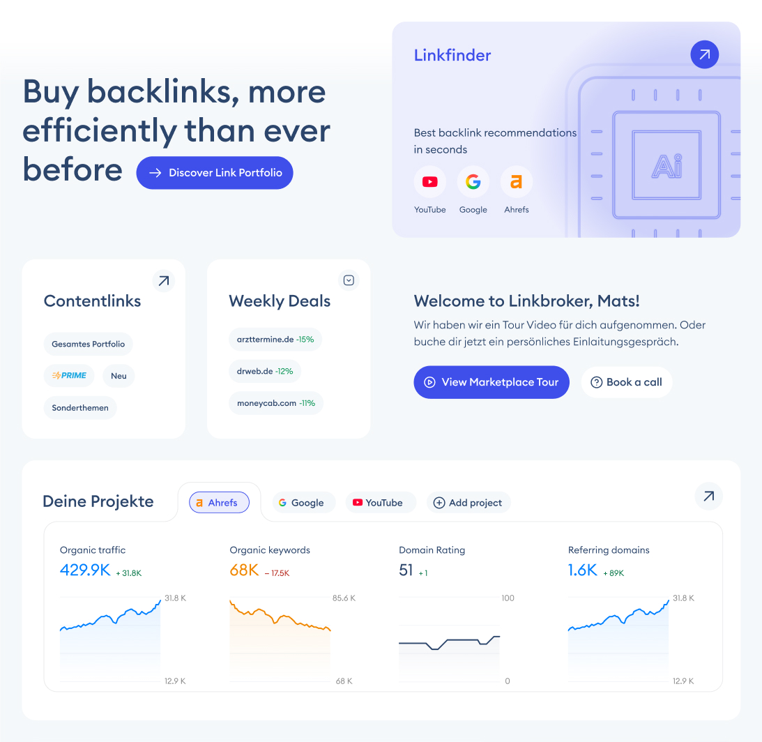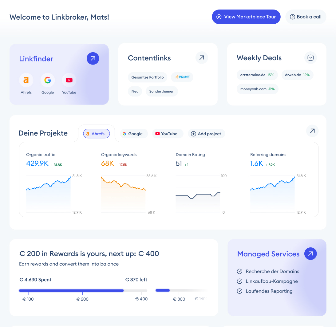The first thing you notice when you land on the new dashboard – after the welcome headline – is the Linkfinder tile. It's the only dark element on a light screen, sitting in the top right, and it jumps at you before anything else. That's on purpose: Linkfinder is the highest-value feature on the marketplace, so I made it the heaviest thing in the visual field. Second priority is the Projects block – big tile, detailed analytics graphs, the only place on the screen where that kind of data shows up. Between those two, the user's first five seconds on the page are spent on the two things that actually matter: the tool that makes the marketplace worth using, and the numbers that tell them whether it's working.