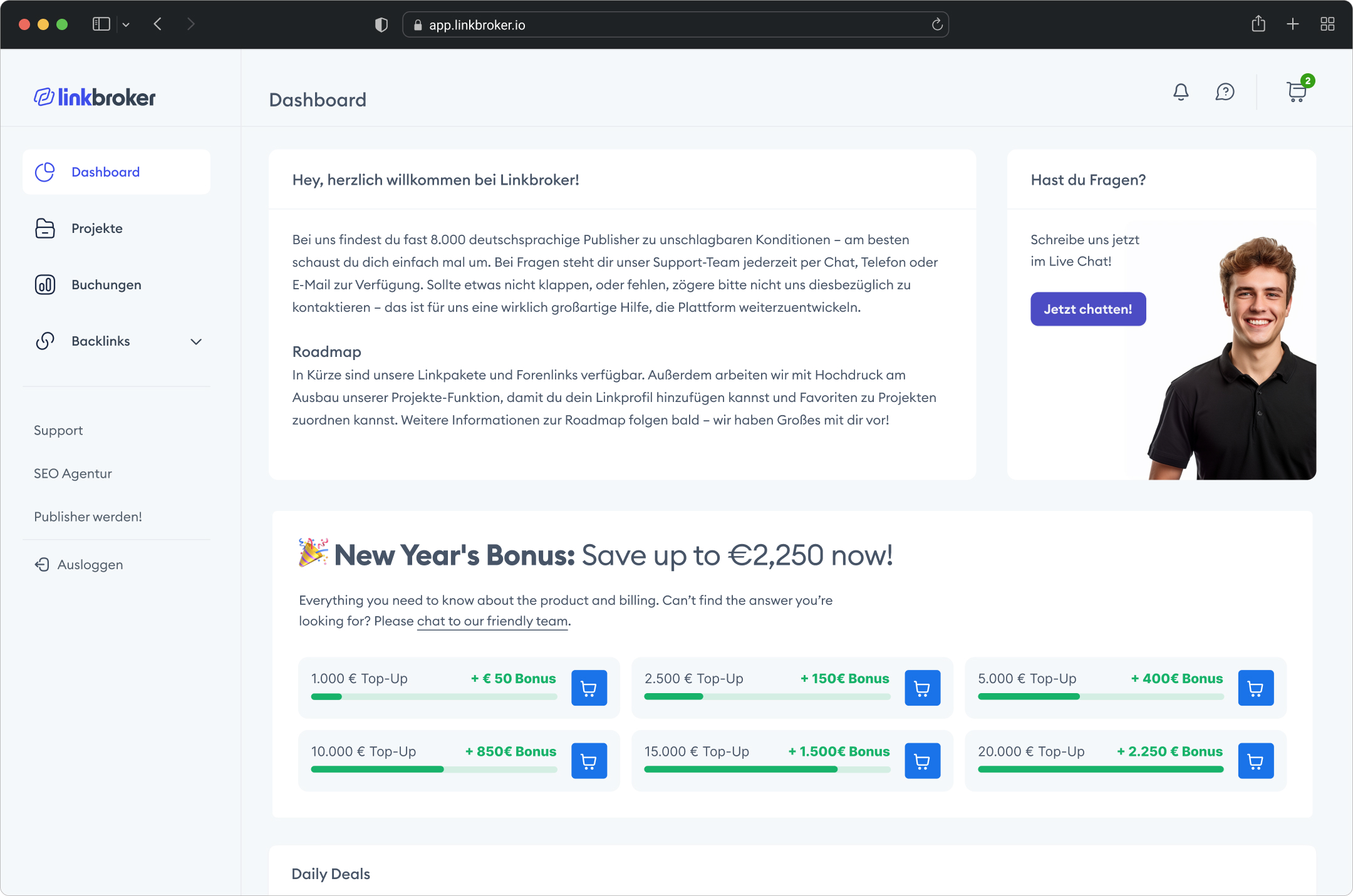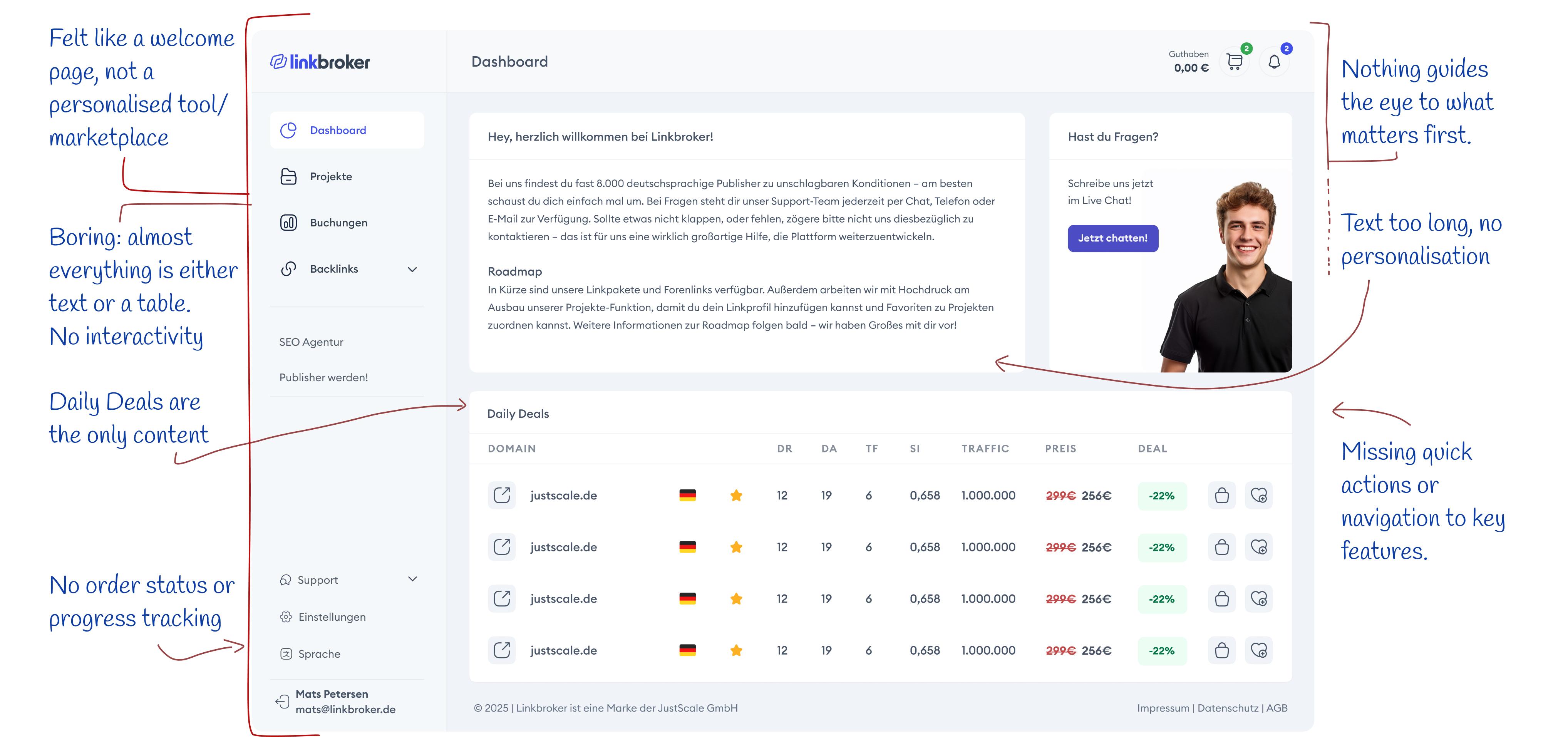 LinkBroker's dashboard hadn't changed since launch. It was the first screen every user saw, every day – and it gave them nothing. A static welcome message, a stock photo support card, and a Daily Deals table below the fold. No dynamic content, no personalisation, nothing that changed between visits. For a screen with that much daily traffic, it was completely wasted – and what was there was sales-oriented rather than user-centric.