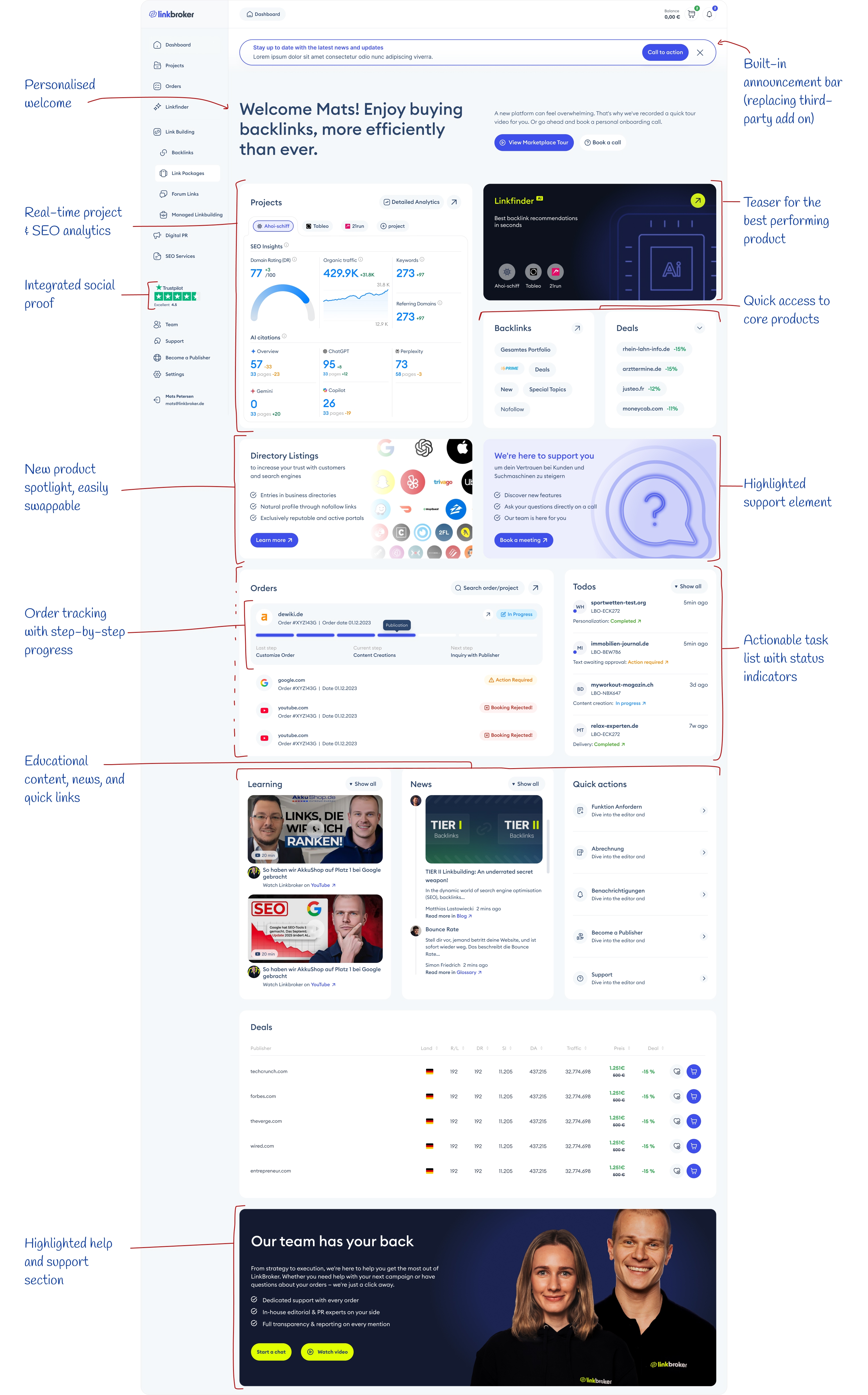 The annotated version below calls out the decisions that mattered most. Some are structural – the personalised welcome, the Linkfinder teaser as the visual anchor, the integrated social proof. Others are about what replaced what – the built-in announcement bar took over from a third-party add-on, and the order tracking gave users visibility they previously had to leave the dashboard for. Each annotation is a small decision. Together they're the difference between a welcome screen and a working tool.