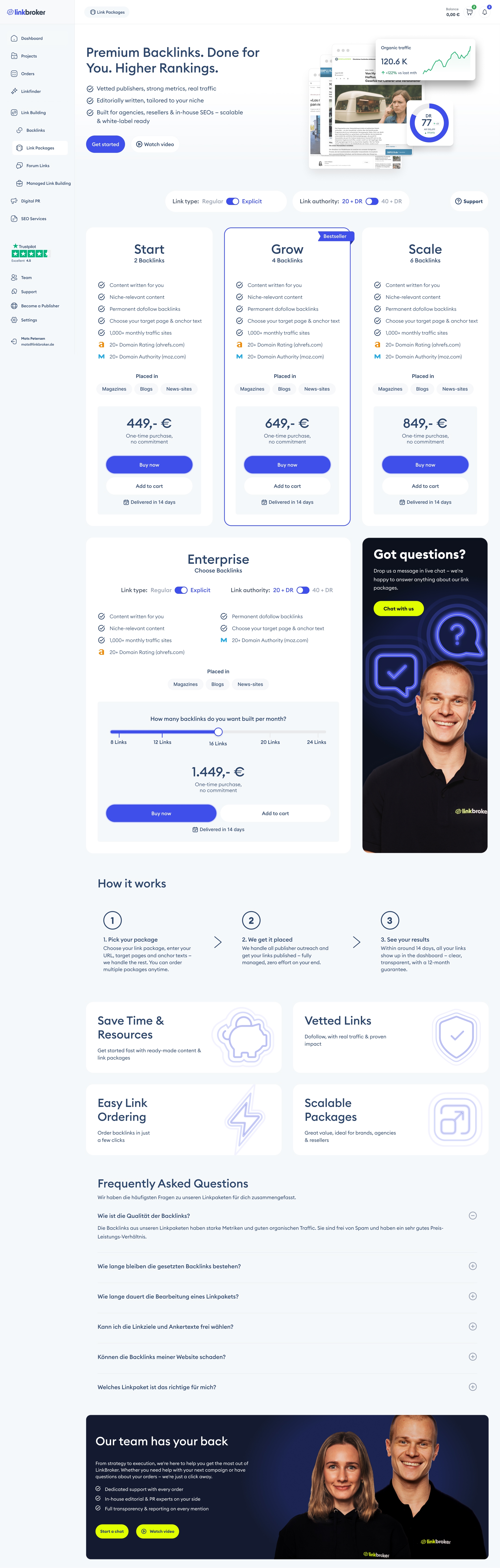 Because Enterprise needs more space than a fixed-price card, it couldn't sit in the same row as Start, Grow, and Scale. I gave it its own row, paired with the "Got questions?" tile. That solved two problems at once: Enterprise got the prominence it deserved, and a four-card row – which tends to look cramped – became a cleaner three-plus-one layout. Throughout the page, the design surfaces help in multiple forms: a tutorial video, a live chat button, a strategy call booking. Agencies buying link packages don't always know what they actually need, and making it easy to ask is part of how the page sells.