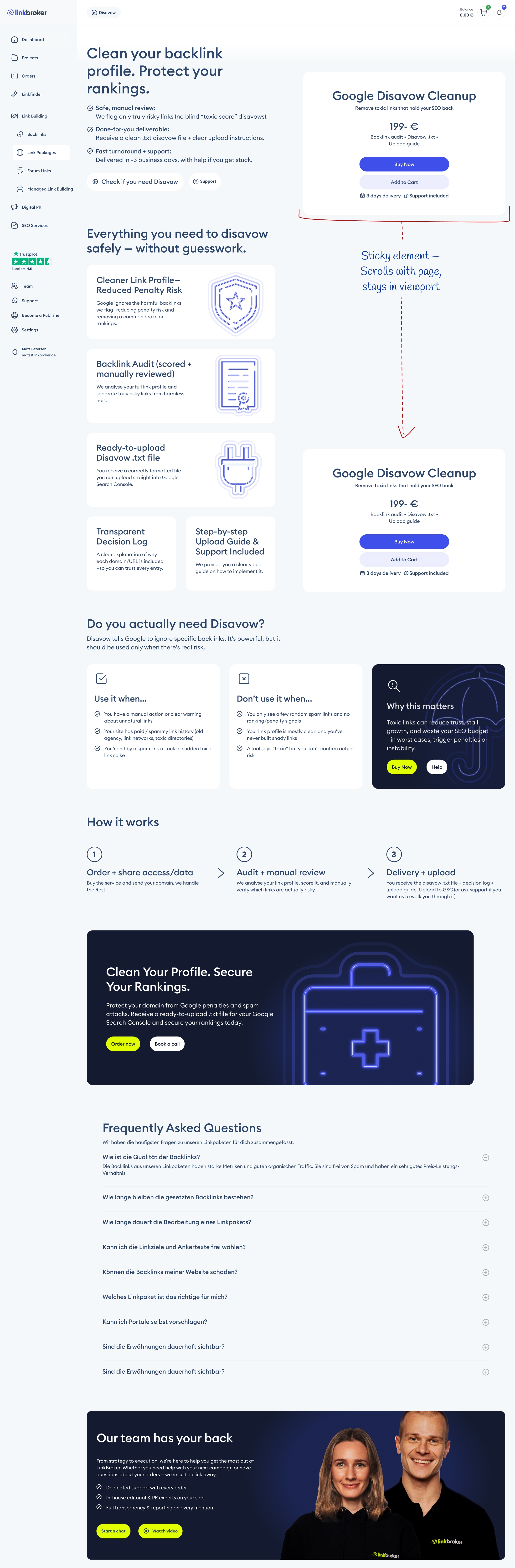 The layout splits into two halves. The left is slim and informational – what Disavow is, when to use it, when not to use it, how the process works. Keeping the explanation column narrow makes it scannable instead of wall-of-text. The right is a sticky buy box, so once a buyer decides they want it, the purchase button is already in their viewport – no scrolling back up. The pattern is borrowed from e-commerce product pages, and it works for the same reason: reading and buying are two different mental modes, and a good page lets the user switch between them without friction.