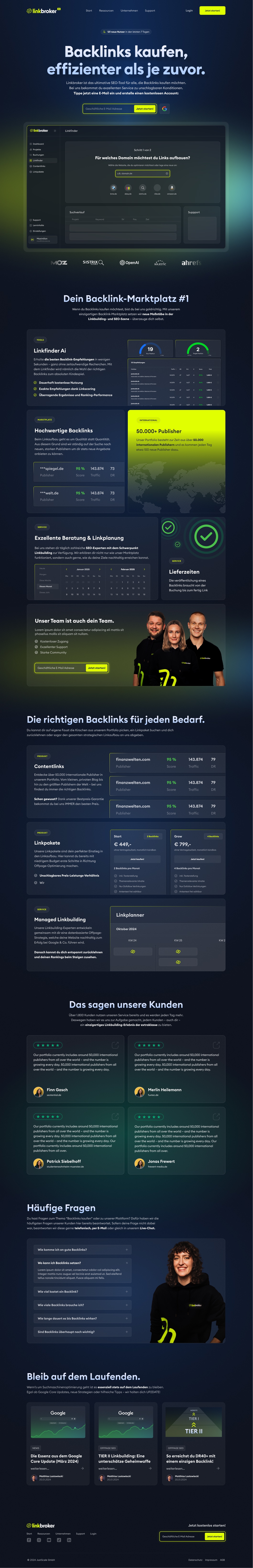 Linkbroker – As co-founder, I led the buyer-facing website for one of Germany's leading SEO link marketplaces (100,000+ publishers, 9,100+ users, €2.4M revenue at exit). The site's job: turn SEO agencies and in-house marketers into signups, then walk them through three distinct offers — self-serve marketplace, fixed link packages, and managed link-building. Available in English and German. Full brand system — logo, merch, campaigns, exhibition stand, hoodies, business cards — built alongside.