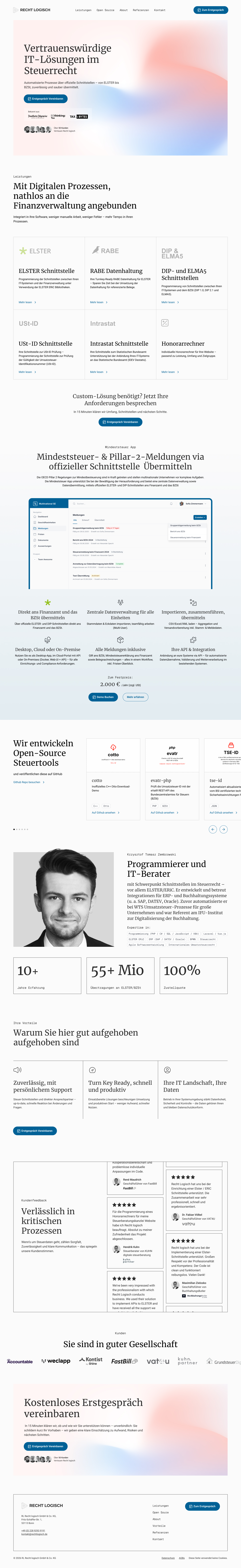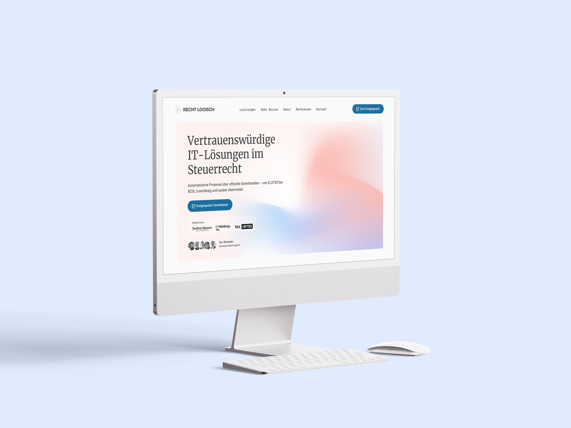 Recht Logisch – Strategy, design, and development for a German tax-compliance IT firm. Structured six product lines, technical credibility, and a founder story into a single clear page.